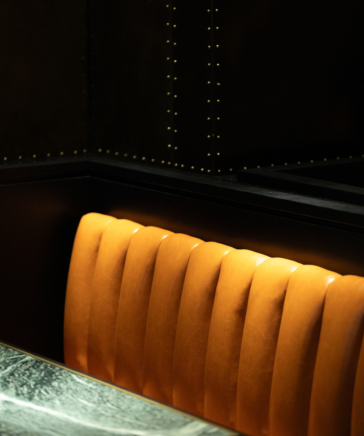 An abstracted patchwork motif, inspired by the unique topography of traditional Thai rice paddy fields, is used throughout - from the marble flooring pattern, metal screen structures to custom lighting and metal cladding. Rich and contrasting materiality define Crying Tiger, from marbles in a leathered finish (matt and subtly textured), patinaed metals and stacked terracotta tiles to delicate drapery fabrics in emerald, golden ochre, amber and saffron. Authentic Thai elements come in the form of luxurious glazed tiles and three commissioned statement chandeliers, crafted by Thai artist PiN from repurposed waste metal.