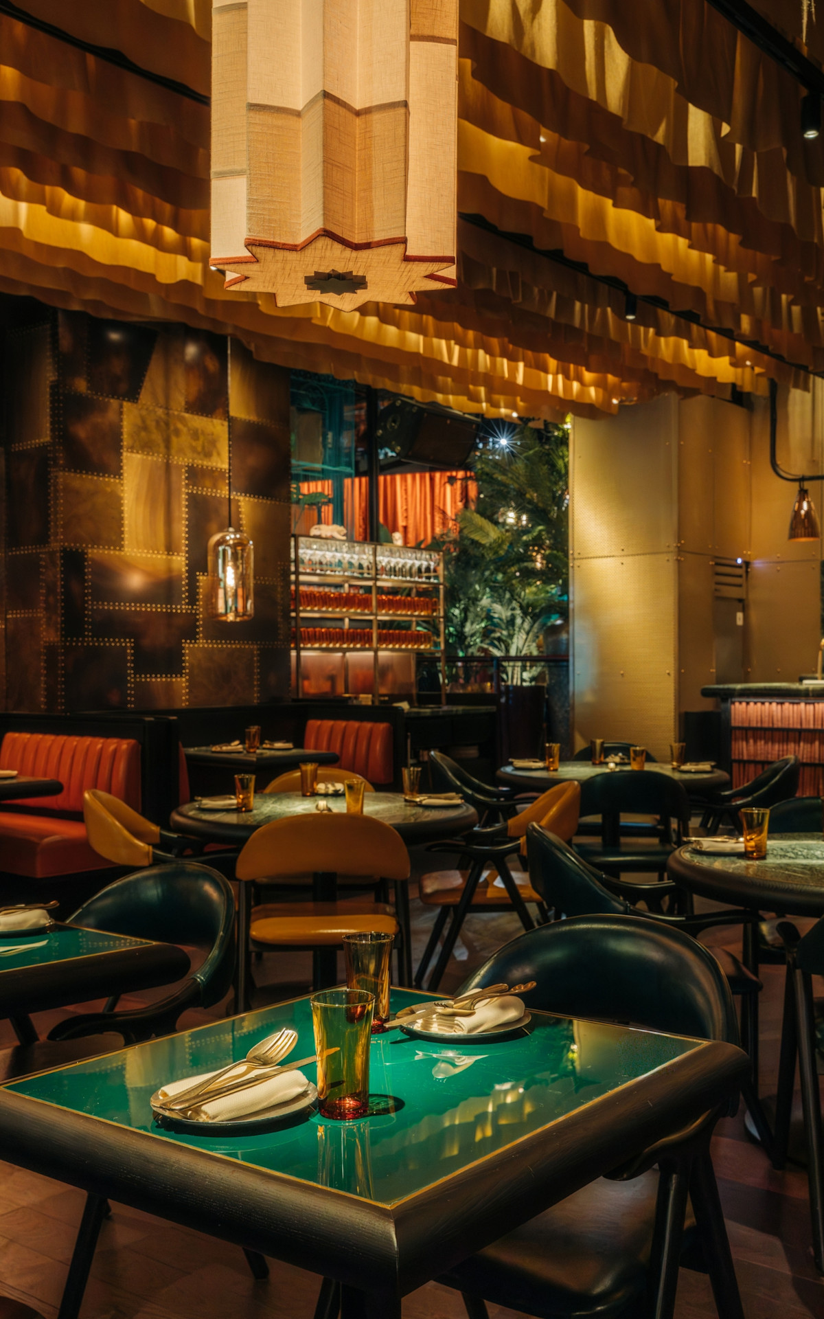 Exposed ceilings, plaster and metal mesh wall finishes are contrasted with an abundance of rich drapery fabrics, hanging from the ceiling and cocooning diners. An open kitchen concept transforms the dining room into a performance space, with fire, heat, and culinary craftsmanship on full display.