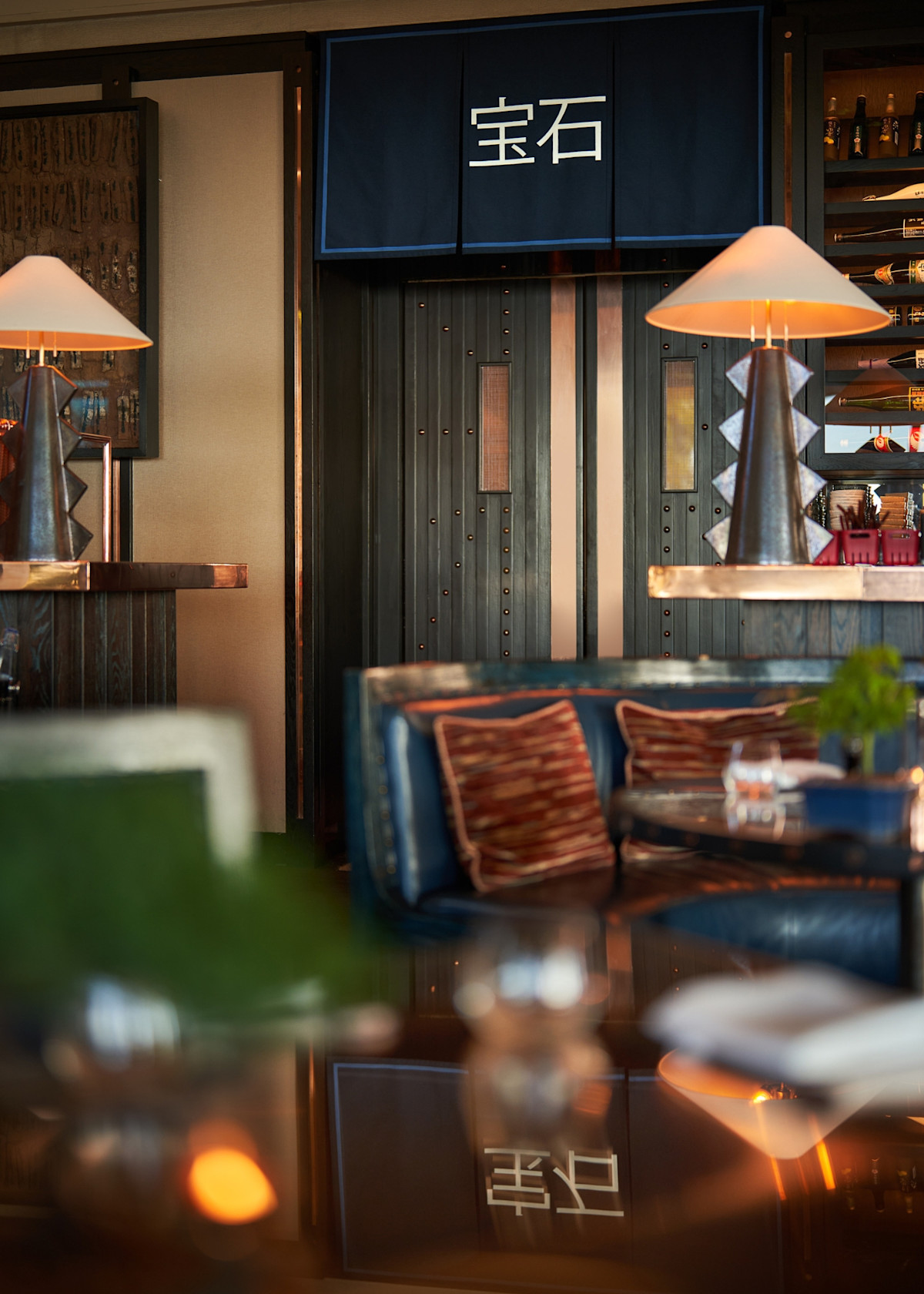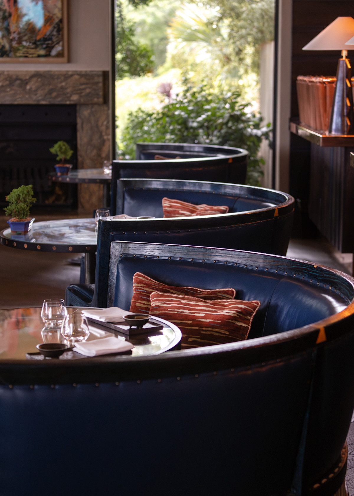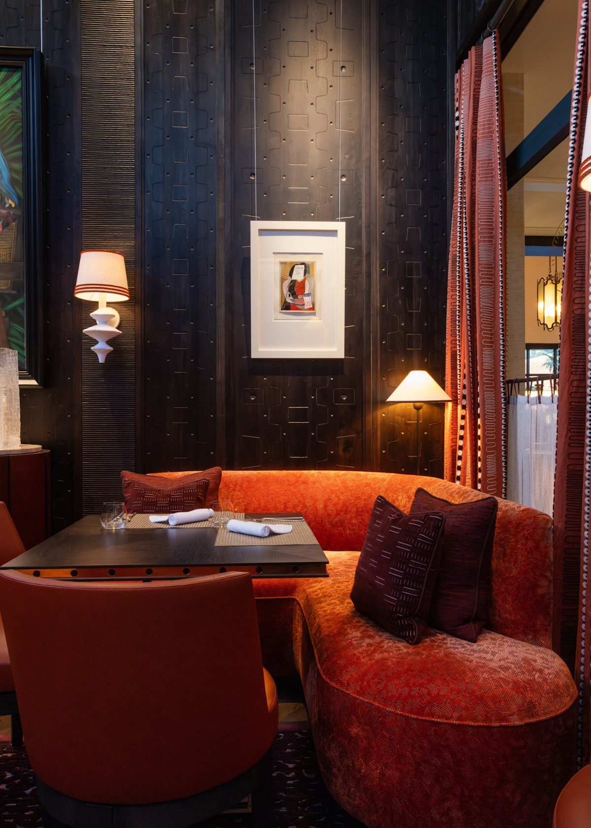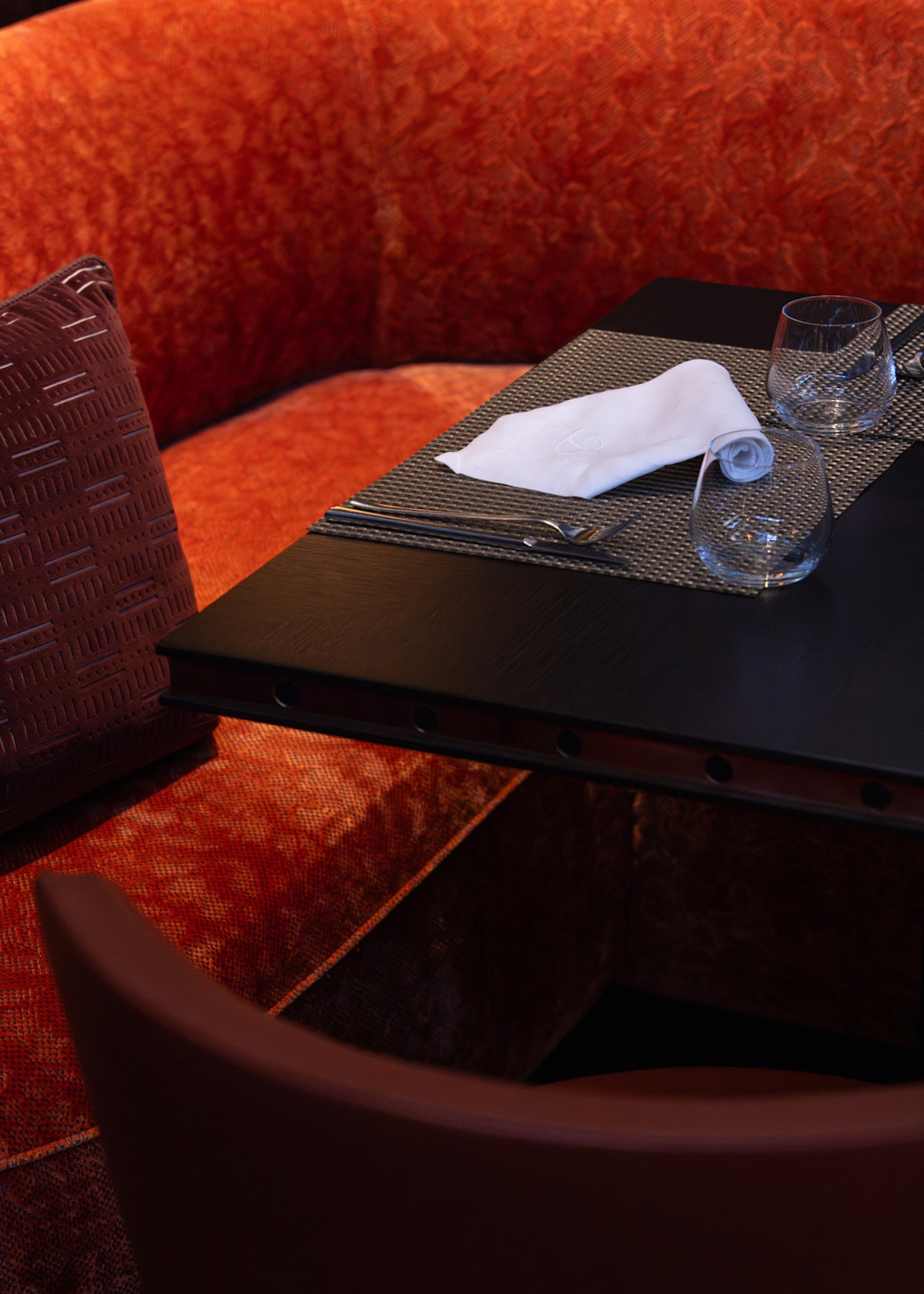 Delaire’s other eating establishment, Indochine restaurant (think Afro-fusion fare), was designed by DCS around a shimmering roof sculpture consisting of a reflective swarm of swallows (birds which migrate from Europe in summer and are seen darting about in their hundreds in the African sky). Other notable design elements include the Pierre Cronje orange leather banquettes that snake through the space like giant songololo centipedes.